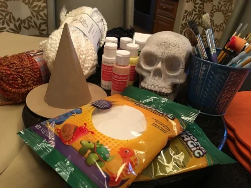 For some reason, Hocus Pocus is bigger now than it has ever been. Being one of a few Disney Halloween movies, I think that it will always have a strong cult following. The kids watched it for the first time this year and loved it. Recently, I saw some paper mache' witches hats at Michael's and thought it would be fun to do a Hocus Pocus themed display on our mantle.