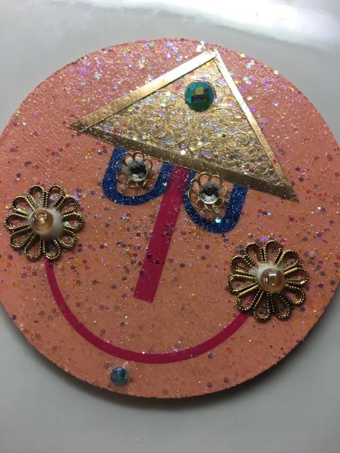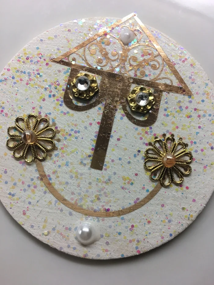 Designing the applique was intimidating for Heidi because Mary Blair has been a huge artistic influence for her. She didn’t want to do anything that would make Mary roll her her grave. The facade is very geometric and falls into a grid-like pattern. The gold elements needed to stand out and deserved more than just gold puff paint. Kit Kraft is a wonderful hobby store in Studio City and the girls hit literal gold when they decided to explore their incredible jewelry findings section.